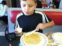 | Today, my grandpa and I woke up at 4:30am, and we drove to Alverado TX. and went to the Waffle Housefor breakfast. It was delicious. I had a huge waffle, ham, and over medium eggs. After we did that, we drove to Oklahoma City to go to the Science Museum of Oklahoma. At the museum we saw alot of cool things, but my favorite part was hanging out with my grandpa. After the museum, we checked into our hotel, the Sleep Inn, in OKC. Then we went to the WEDGE PIZZERIA. It was delicious. I had a pizza with crimini mushrooms, pepperoni, with fresh mozzarella,and marinara sauce. Then we went back to the hotel. The total number of miles we drove was 485 miles. That what I have done on 7/21/13. |